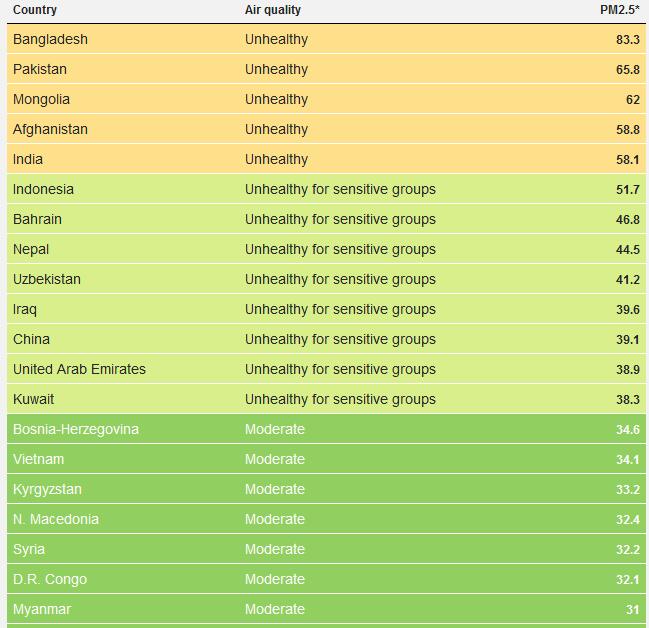 南亞的情況不甚樂觀,在30個(gè)污染最嚴(yán)重的城市中,印度、巴基斯坦或孟加拉國有27個(gè)。其中,巴基斯坦的古吉蘭瓦拉(Gujranwala),費(fèi)薩拉巴德(Faisalabad)和萊溫(Raiwind)是污染最嚴(yán)重的十個(gè)城市之一,新德里、拉合爾和達(dá)卡等主要人口中心分別排在第5、12和21位。