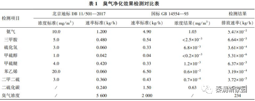 技改完成后,廠房?jī)?nèi)負(fù)壓明顯。干化機(jī)尾氣輸送管道無(wú)明顯臭氣外泄,干化機(jī)軸承附近及尾氣風(fēng)機(jī)小室內(nèi)負(fù)壓收集效果較好,臭氣外溢情況顯著改善。干化車間內(nèi)臭氣經(jīng)酸堿洗滌+UV光解+等離子分解后,臭氣排放濃度遠(yuǎn)低于該項(xiàng)目地方標(biāo)準(zhǔn)《北京市大氣污染物綜合排放標(biāo)準(zhǔn)》(DB11/501—2017)和國(guó)家標(biāo)準(zhǔn)《惡臭污染物排放標(biāo)準(zhǔn)》(GB14554—93)的要求,詳見表1。