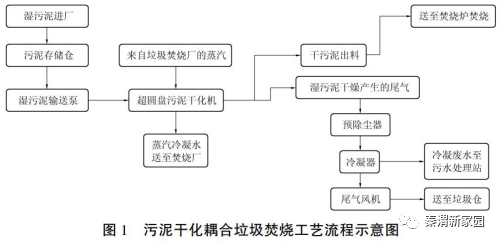 濕污泥干化過(guò)程產(chǎn)生的廢氣經(jīng)末端的尾氣引風(fēng)機(jī)抽引后,從干化機(jī)尾氣排放口排出,并維持干化機(jī)及輔助設(shè)備、系統(tǒng)管路微負(fù)壓運(yùn)行。被抽出的廢蒸汽(蒸汽和空氣混合物)經(jīng)除塵和冷凝處理,廢氣冷凝液納入廠區(qū)污水收集管網(wǎng)統(tǒng)一處理,而不凝尾氣則由尾氣引風(fēng)機(jī)抽引送至生活垃圾焚燒發(fā)電廠區(qū)垃圾池內(nèi)。