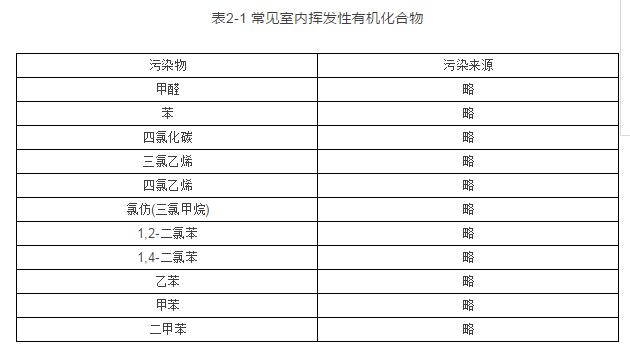 世界衛(wèi)生組織工作小組所發(fā)表的《就對(duì)室內(nèi)空氣污染物(根據(jù)1984年認(rèn)識(shí)水平)的關(guān)注所達(dá)成的共識(shí)》報(bào)告中列示了室內(nèi)環(huán)境中通常可找到的揮發(fā)性有機(jī)化合物(見(jiàn)表2-1)。