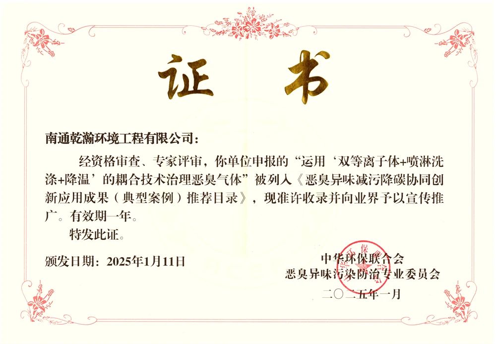 【科技賦能 助力環(huán)保】南通乾瀚在中華環(huán)保聯(lián)合會惡臭異味污染防治專業(yè)委員會成立大會上,獲得中華環(huán)保聯(lián)合會典型案例推薦目錄證書