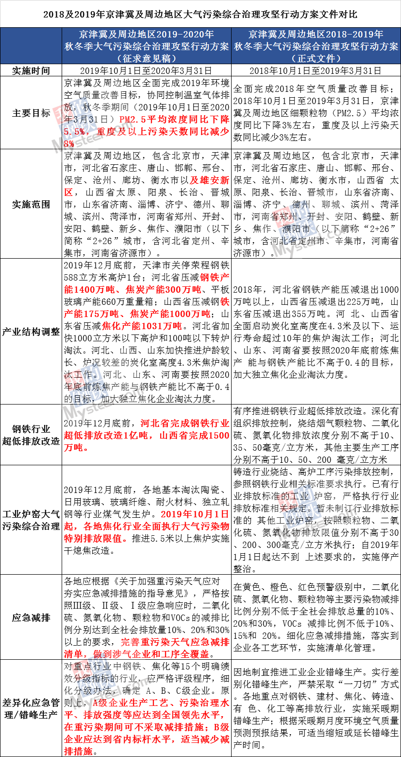 《京津冀及周邊地區(qū)2019-2020年秋冬季大氣污染綜合治理攻堅行動方案(征求意見稿)》即停工令發(fā)布。對“京津冀及周邊地區(qū)2019-2020年秋冬季大氣污染綜合治理攻堅行動方案(征求意見稿)”進行了整理,通過與《京津冀及周邊地區(qū)2018-2019年秋冬季大氣污染綜合治理攻堅行動方案》對比,有如下重點內(nèi)容發(fā)生了變動: