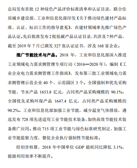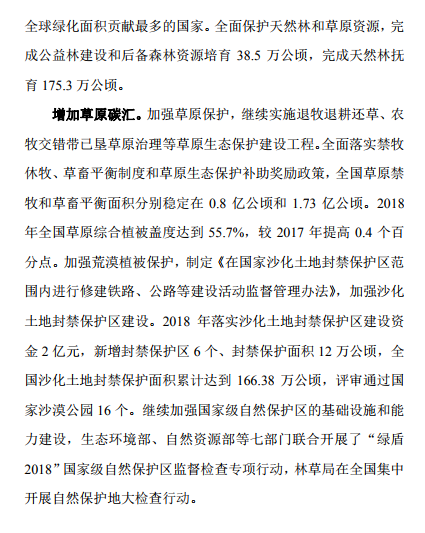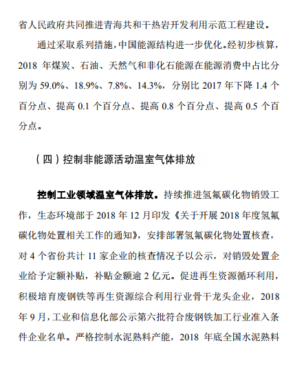 經(jīng)初步核算,2018 年中國單位國內(nèi)生產(chǎn)總值(GDP)二氧 化碳排放(以下簡稱碳強度)下降 4.0%,比 2005 年累計下降 45.8%,相當(dāng)于減排 52.6 億噸二氧化碳,非化石能源占能源消費 總量比重達到 14.3%,基本扭轉(zhuǎn)了二氧化碳排放快速增長的局面。 大規(guī)模國土綠化和生態(tài)保護修復(fù)工程持續(xù)推進,適應(yīng)氣候變化能力不斷增強,應(yīng)對氣候變化體制機制不斷完善,全社會應(yīng)對氣候 變化意識不斷提高,為應(yīng)對全球氣候變化做出了重要貢獻。