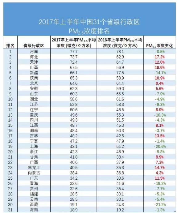 ?2017年上半年31個(gè)省級(jí)行政區(qū)PM2.5排名表