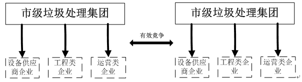 垃圾處理行業(yè)目前是典型的市場壟斷行業(yè)。因此,橫向的垃圾處理模式可以打破垃圾處理行業(yè)的市場壟斷,打通各個城市的垃圾處理企業(yè),開展有效競(如下圖)。這樣一來,各個城市的垃圾處理行業(yè)不僅可以按照市場經(jīng)濟(jì)的原則自愿承接跨區(qū)域生活垃圾處理業(yè)務(wù),并且有利于各公司改進(jìn)管理水平和技術(shù)水平,同時形成一體化的垃圾處理行業(yè)市場,提高處理行業(yè)的運(yùn)營效率。