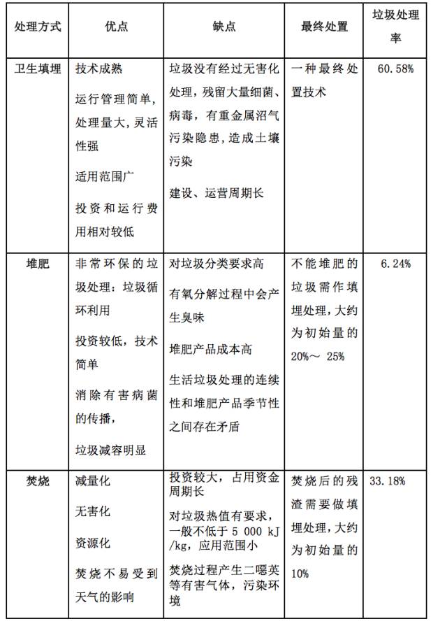 世界上垃圾常規(guī)處理工藝有填埋、堆肥和堆肥。發(fā)達(dá)國家和地區(qū)一般在分類收集的基礎(chǔ)上,采用衛(wèi)生填埋、焚燒和堆肥工藝,發(fā)展中國家仍大量采用簡易填埋等方式。目前在中國,城市生活垃圾的處理主要還是以填埋為主,但是填埋技術(shù)、處理方式和管理水平有很大差異;堆肥和焚燒(15%)處理技術(shù)占的比例較小,垃圾處理能力較低,存在明顯的地域性差異。近幾年,焚燒的比例在不斷怎長。以下表格梳理了三種常見的垃圾處理方式的優(yōu)缺點(diǎn)以及它的垃圾處理率。