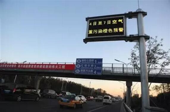 3日,東四環(huán)交通提示牌提示市民4日到7日將會迎來空氣重度污染。當天上午,北京發(fā)布空氣重污染橙色預警。