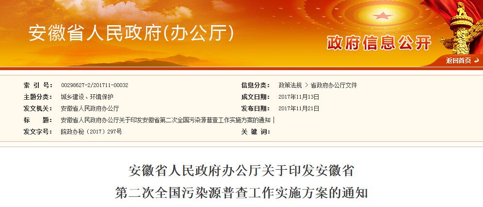 安徽省政府辦公廳日前下發(fā)《關于印發(fā)安徽省第二次全國污染源普查工作實施方案的通知》,為指導做好安徽省第二次全國污染源普查工作,制定了《安徽省第二次全國污染源普查工作實施方案》。