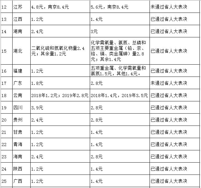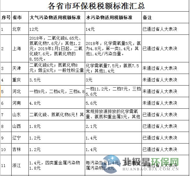 大氣污染物稅額標準為每污染當量1.2元,水污染物稅額標準為每污染當量1.4元。(已通過省人大表決)