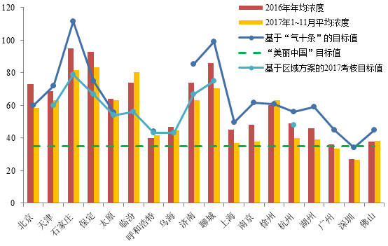 18個抽選城市中,13[1]個城市1~11月PM2.5平均濃度較“大氣十條”考核目標值低1~30μg/m3,有望在年底完成考核目標。其中北京市1~11月PM2.5平均濃度為59μg/m3,低于“京控”60μg/m3的削減目標;