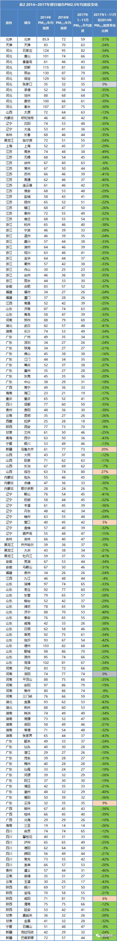 2.本文所用2016年度及2017年1~11月PM2.5平均濃度均由蔚藍地圖根據(jù)其收集的國、省、市控空氣質(zhì)量監(jiān)測站監(jiān)測數(shù)據(jù)進行計算,參照《環(huán)境空氣質(zhì)量評價技術(shù)規(guī)范(試行)》(HJ663-2013)中城市污染物濃度統(tǒng)計方法,按長江以南城市站點監(jiān)測濃度>2000微克/立方米,其他站點濃度>10000微克/立方米為基準值對原始數(shù)據(jù)進行清洗,數(shù)據(jù)統(tǒng)計的有效性未嚴格按照技術(shù)規(guī)范,未按照《受沙塵天氣過程影響城市空氣質(zhì)量評價補充規(guī)定》剔除沙塵影響,若有統(tǒng)計結(jié)果出入,請聯(lián)系蔚藍地圖。