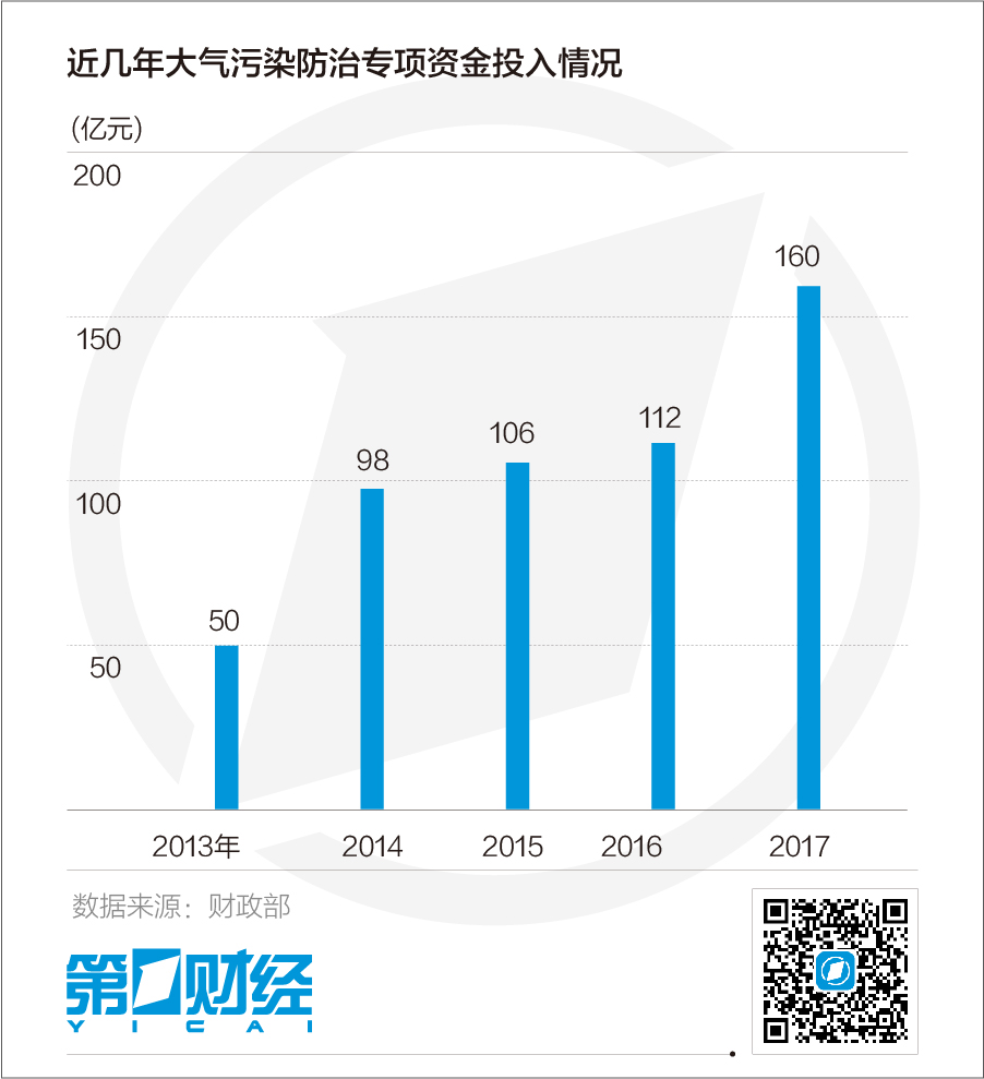 中央財(cái)政也專(zhuān)門(mén)設(shè)立大氣污染防治專(zhuān)項(xiàng)資金,投入力度持續(xù)加大。數(shù)據(jù)顯示,2013年至2017年,中央財(cái)政分別安排大氣污染防治專(zhuān)項(xiàng)資金50億元、98億元、106億元、112億元和160億元,累計(jì)下達(dá)527.88億元專(zhuān)項(xiàng)資金和100多億元中央預(yù)算內(nèi)投資。