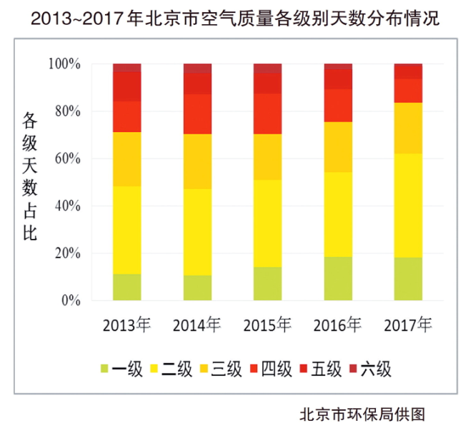 2017年,全國(guó)地級(jí)及以上城市可吸入顆粒物(PM10)平均濃度比2013年下降22.7%;首批實(shí)施新環(huán)境空氣質(zhì)量標(biāo)準(zhǔn)的74個(gè)城市優(yōu)良天數(shù)比例上升12個(gè)百分點(diǎn),達(dá)到73%;重污染天數(shù)比例下降5.7個(gè)百分點(diǎn),達(dá)到3%。