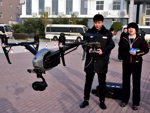 2017年11月21日,河北省文安縣左各莊鎮(zhèn)環(huán)保所工作人員向記者演示無(wú)人機(jī)執(zhí)法。攝影/章軻