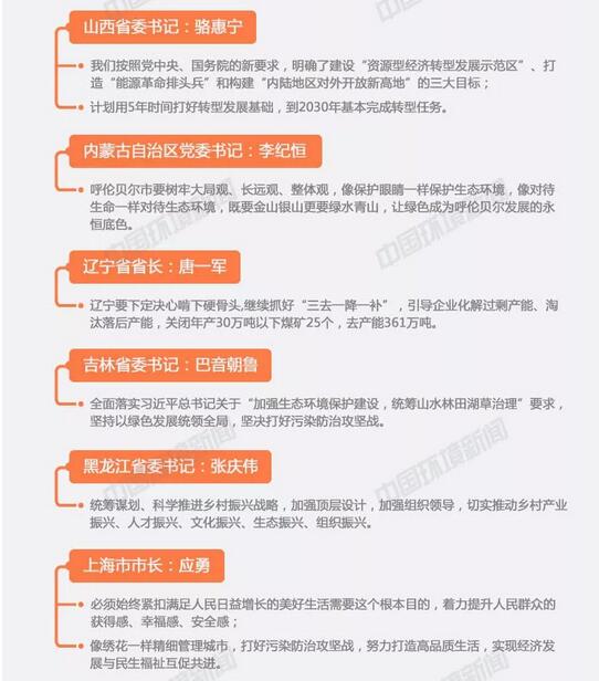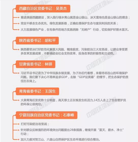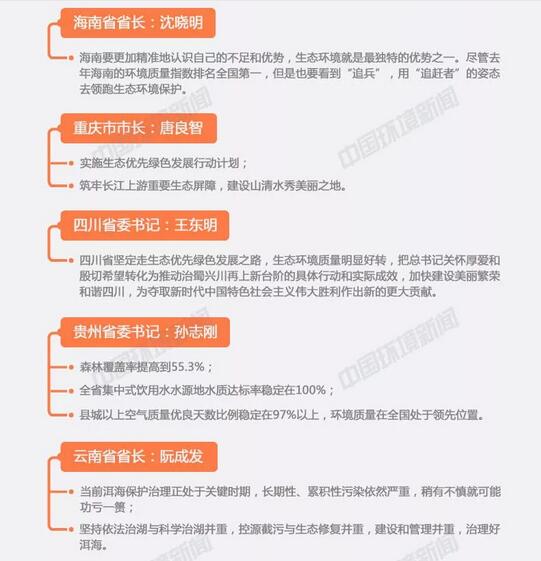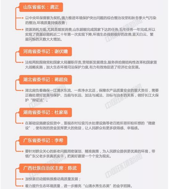 兩會(huì)期間,作為全國(guó)人大代表,各省(市、區(qū))黨政一把手分別謀劃好、推動(dòng)好這場(chǎng)污染防治攻堅(jiān)戰(zhàn)。其中,既有對(duì)本地區(qū)生態(tài)環(huán)境工作的總結(jié),建設(shè)美麗中國(guó)取得的成果,又有對(duì)下一步打好污染防治攻堅(jiān)戰(zhàn),補(bǔ)齊生態(tài)短板工作任務(wù)的規(guī)劃。不僅有成功經(jīng)驗(yàn),還有失敗教訓(xùn),但均形成了“綠水青山就是金山銀山”、堅(jiān)定不移地走綠色低碳循環(huán)發(fā)展道路的共識(shí)。
