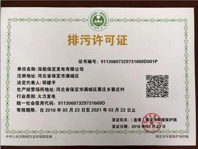 3月23日,保定市環(huán)境保護(hù)局核發(fā)了新的生態(tài)環(huán)境部監(jiān)制的第一張排污許可證: