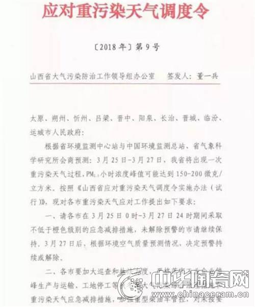山西省大氣污染防治工作領(lǐng)導(dǎo)組辦公室3月23日發(fā)布了今年第9號應(yīng)對重污染天氣調(diào)度令,要求除大同外各市于3月25日0時-3月27日24時期間,積極應(yīng)對重污染天氣過程。