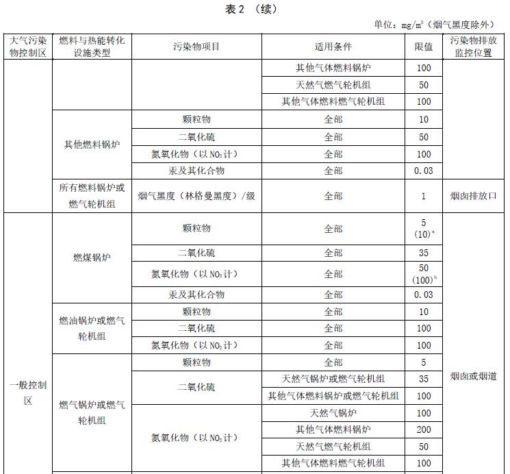 2016年9月20日起至本標(biāo)準(zhǔn)實(shí)施之日前環(huán)境影響評(píng)價(jià)文件通過(guò)審批的燃煤鍋爐建設(shè)項(xiàng)目,2017年1月1日起至本標(biāo)準(zhǔn)實(shí)施之日前環(huán)境影響評(píng)價(jià)文件通過(guò)審批的燃油、燃?xì)忮仩t或燃?xì)廨啓C(jī)組及其他燃料鍋爐建設(shè)項(xiàng)目,以及新建火力發(fā)電鍋爐或燃?xì)廨啓C(jī)組項(xiàng)目,自本標(biāo)準(zhǔn)實(shí)施之日起按所在控制區(qū)執(zhí)行表2中的排放濃度限值。