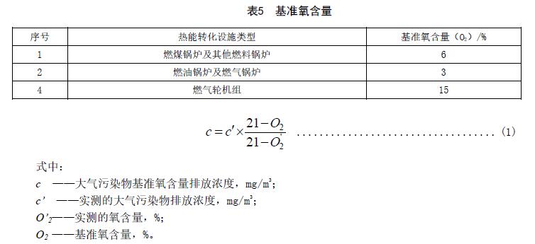 實(shí)測(cè)的火電廠顆粒物、二氧化硫、氮氧化物和汞及其化合物排放濃度,必須按公式(1)折算為基準(zhǔn)氧含量排放濃度。各類鍋爐或燃?xì)廨啓C(jī)組的基準(zhǔn)氧含量按表5的規(guī)定執(zhí)行。