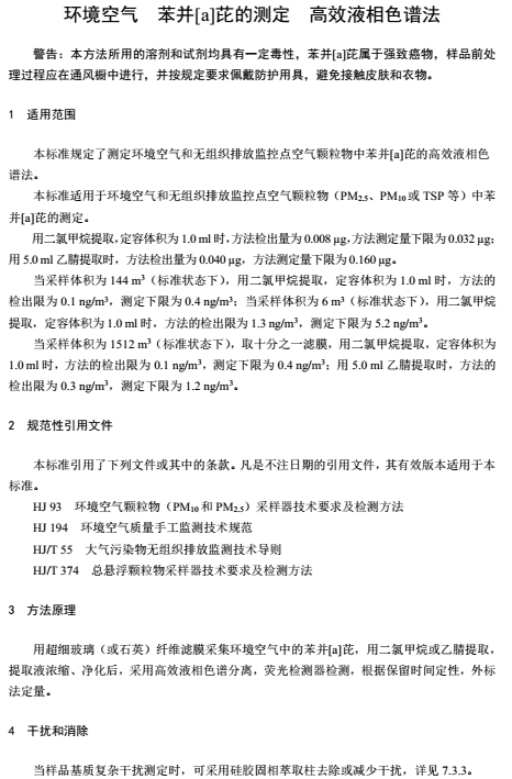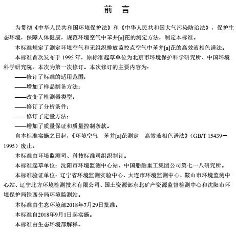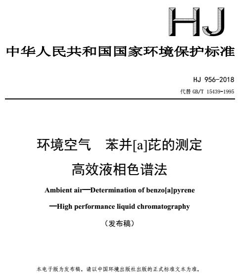 為貫徹《中華人民共和國環(huán)境保護(hù)法》和《中華人民共和國大氣污染防治法》,保護(hù)生態(tài)環(huán)境,保障人體健康,規(guī)范環(huán)境空氣中苯并[a]芘的測定方法,制定本標(biāo)準(zhǔn)。本標(biāo)準(zhǔn)規(guī)定了測定環(huán)境空氣和無組織排放監(jiān)控點(diǎn)空氣中苯并[a]芘的高效液相色譜法。