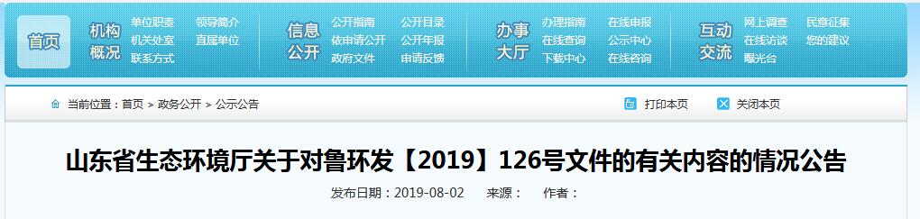 山東省生態(tài)環(huán)境廳關于對魯環(huán)發(fā)【2019】126號文件的有關內(nèi)容的情況公告