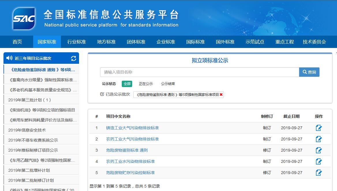 《危險廢物鑒別標準 通則》等5項擬立項強制性國家標準項目公示