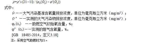 本標(biāo)準(zhǔn)規(guī)定的各項(xiàng)污染物濃度的排放限值,均指在標(biāo)準(zhǔn)狀態(tài)下以11%(V/V%)O2(干煙氣)作為換算基準(zhǔn)換算后的基準(zhǔn)氧量排放濃度,按下式進(jìn)行換算: