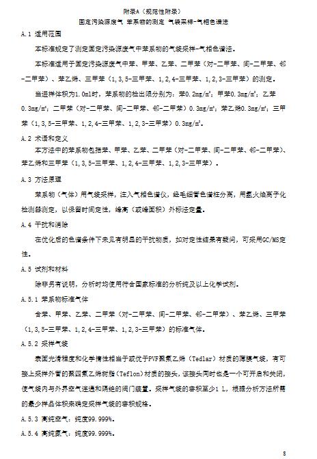 對(duì)大氣污染物排放濃度的測(cè)定采用表5所列的監(jiān)測(cè)方法或生態(tài)環(huán)境主管部門(mén)認(rèn)定的等效方法,本標(biāo)準(zhǔn)實(shí)施后國(guó)家發(fā)布的污染物監(jiān)測(cè)方法標(biāo)準(zhǔn),如適用性滿(mǎn)足要求,同樣適用于本標(biāo)準(zhǔn)相應(yīng)污染物的測(cè)定。