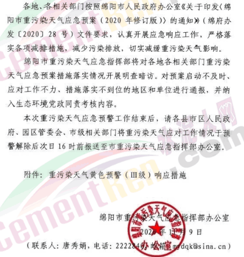 據(jù)水泥人網(wǎng)了解,綿陽市發(fā)布的《重污染天氣黃色預(yù)警(Ⅲ級(jí))響應(yīng)措施》要求包括健康防護(hù)措施、倡議性污染減排措施和強(qiáng)制性污染減排措施。