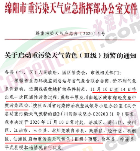 日前,水泥人網(wǎng)從四川省污染防治攻堅(jiān)戰(zhàn)領(lǐng)導(dǎo)小組辦公室獲悉,11月10日零時(shí),成都、自貢、瀘州、德陽、綿陽、內(nèi)江、樂山、眉山、宜賓、資陽10市將啟動(dòng)重污染天氣黃色預(yù)警。根據(jù)四川省生態(tài)環(huán)境監(jiān)測總站與省氣象臺(tái)聯(lián)合會(huì)商,受不利氣象條件影響,擴(kuò)散條件轉(zhuǎn)差,2020年11月10日至14日將出現(xiàn)一次區(qū)域性污染過程,成都平原及川南地區(qū)城市有輕度至中度污染風(fēng)險(xiǎn)。按照《四川省重污染天氣應(yīng)急預(yù)案(2018年修訂)》要求,成都、自貢、瀘州、德陽、綿陽、內(nèi)江、樂山、眉山、宜賓、資陽應(yīng)于11月10日零時(shí)啟動(dòng)重污染天氣黃色預(yù)警,采取有力措施,減少污染排放,減緩重污染天氣影響。各城市可根據(jù)當(dāng)?shù)厍闆r提高預(yù)警等級(jí)。