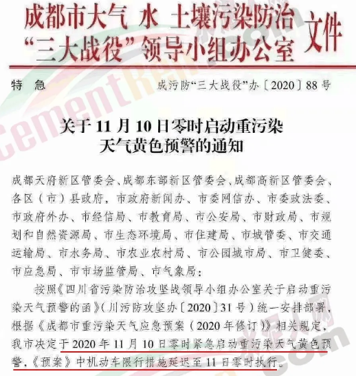 成都市大氣、水、土壤污染防治三大戰(zhàn)役"領(lǐng)導(dǎo)小組辦公室發(fā)布特急文件《關(guān)于11月10日零時(shí)啟動(dòng)重污染天氣黃色預(yù)警的通知》(成污防"三大戰(zhàn)役"辦〔2020〕88號(hào))稱,按照《四川省污染防治攻堅(jiān)戰(zhàn)領(lǐng)導(dǎo)小組辦公室關(guān)于啟動(dòng)重污染天氣預(yù)警的函》(川污防攻堅(jiān)辦〔2020〕31號(hào))統(tǒng)一安排部署,根據(jù)《成都市重污染天氣應(yīng)急預(yù)案(2020年修訂)》相關(guān)規(guī)定,成都市決定于2020年11月10日零時(shí)緊急啟動(dòng)重污染天氣黃色預(yù)警,《預(yù)案》中機(jī)動(dòng)車限行措施延遲至11日零時(shí)執(zhí)行。