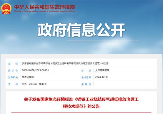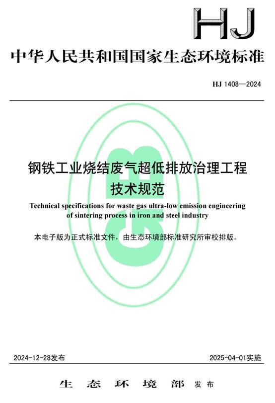 日前,生態(tài)環(huán)境部批準(zhǔn)發(fā)布了《鋼鐵工業(yè)燒結(jié)廢氣超低排放治理工程技術(shù)規(guī)范(HJ 1408—2024)》,這是首次針對鋼鐵工業(yè)燒結(jié)廢氣超低排放治理工程建設(shè)及運行管理制定的國家生態(tài)環(huán)境標(biāo)準(zhǔn)。