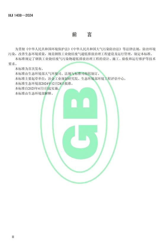 該標(biāo)準(zhǔn)自2025年4月1日起正式實施,旨在貫徹《中華人民共和國環(huán)境保護(hù)法》和《中華人民共和國大氣污染防治法》,指導(dǎo)鋼鐵工業(yè)超低排放改造工作,規(guī)范鋼鐵工業(yè)燒結(jié)廢氣污染物超低排放治理工程的設(shè)計、施工、驗收和運行維護(hù)等技術(shù)要求。