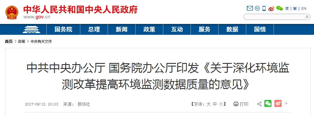 中辦國(guó)辦印發(fā)《關(guān)于深化環(huán)境監(jiān)測(cè)改革提高環(huán)境監(jiān)測(cè)數(shù)據(jù)質(zhì)量的意見》