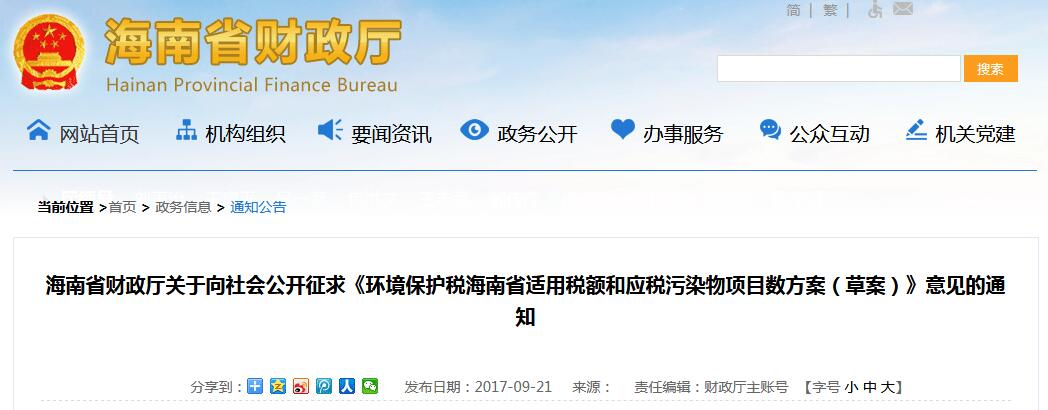 海南省財(cái)政廳關(guān)于向社會(huì)公開(kāi)征求《環(huán)境保護(hù)稅海南省適用稅額和應(yīng)稅污染物項(xiàng)目數(shù)方案(草案)》意見(jiàn)的通知