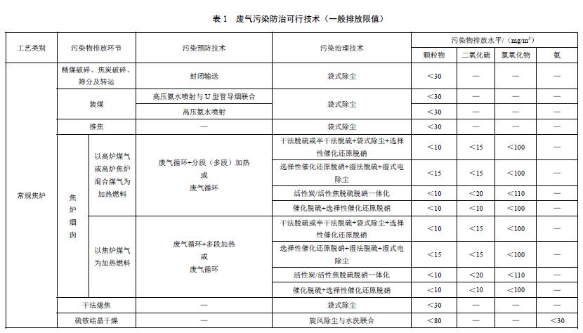 一般可達(dá)到GB16171新建企業(yè)大氣污染物排放濃度限值(一般排放限值)和大氣污染物特別排放限值(特別排放限值)的廢氣污染防治可行技術(shù)分別見(jiàn)表1和表2。